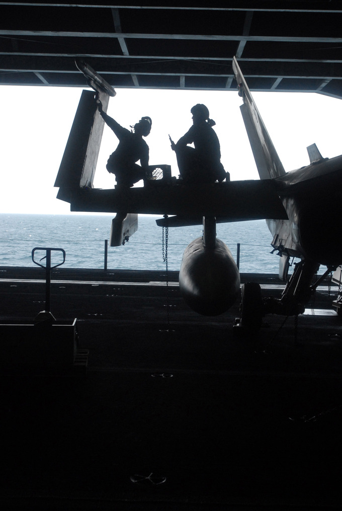 TQM Practices Are Used in Many Industries: Here, two aviation structural mechanics are collaborating on the wing of a F/A-18C Hornet, performing routine maintenance in the hangar bay. TQM practices ensure each person involved with a product is responsible for its quality.